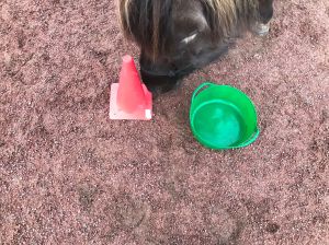 Idag testade jag en ny övning på Reykur. Han skulle ”dutta” på en kon och fick sedan klick + godis i en foderbytta som stod en bit därifrån. Jag började med att ha byttan väldigt nära konen, men ganska snart kunde jag flytta byttan en bit längre bort. Det funkade jättebra! Min duktiga häst 🙂
