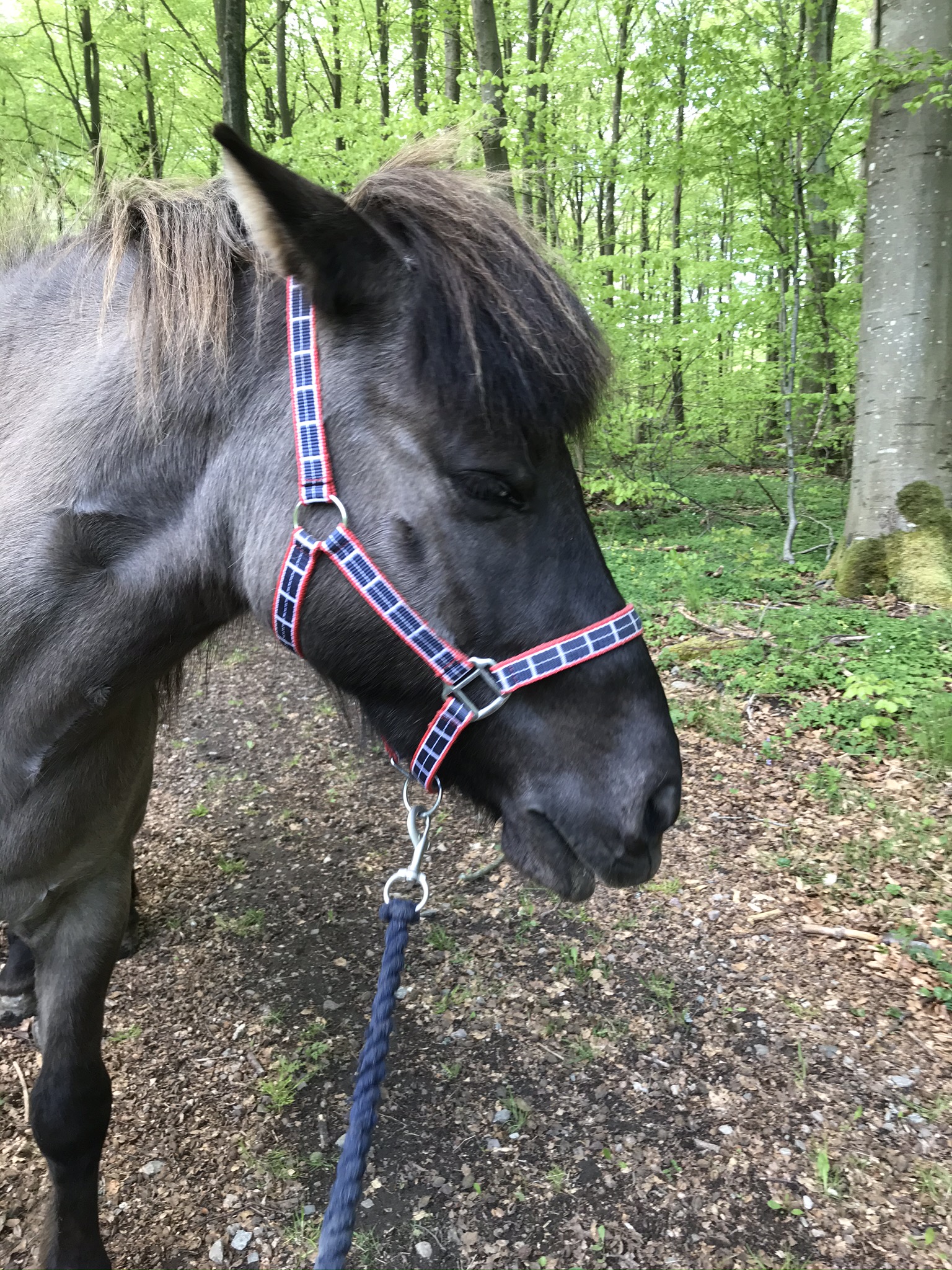 Idag bestämde jag mig för att ta en promenad med Reykur i den ny-gamla skogen. Han har visserligen varit här i sommarhagen förut, men ändå är miljön ny för säsongen så jag vill vara lite förlåtande mot honom i början 🙂 Det var SÅ otroligt vacker i skogen – skirt ljusgrönt – nästan som en saga och Reykur var SÅ otroligt duktig. Vi började lugnt och fint med att bara promenera. Många nya intryck igen och mycket nytt att titta på, så jag lät honom stanna när han själv ville. Var noga med att klicka och ge godis, när han började gå igen. Det blev ganska många stopp på vägen bort från stallet, men han var otroligt lugn och kändes harmonisk 🙂 Halvvägs kom vi till en perfekt backe som gjord för rump-träning 🙂 Sagt och gjort….ett par rundor ner och backa upp – gick som smort!