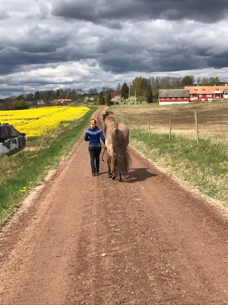 När vi nu har flyttat hästarna till sommarhagen, så ändras ju också förutsättningarna för hur vi tränar då vi inte har en paddock precis utanför hagen. Istället har vi härliga skogsvägar att njuta av 🙂 Även om Reykur har varit i sommarhagen alla somrar, så är ju omgivningarna ändå på något sätt nya för honom och jag tänker låta honom ”bo in sig” i den takt som han behöver. Därför kombinerar jag ridningen med att ta promenader där vi omväxlande pausar, skrittar och travar. Idag gick vi vägen mot vinterhagen. Jag tänker att det kan vara bra att vänja honom vid den så att vi kan rida tillbaka till paddocken vid vinterhagen om vi vill under sommaren. Det blåste rejält men Reykur var superduktig. Lite orolig precis i början när vi kom ut vid öppna fält med mycket vind, men trots det lyssnade han väldigt bra på mig. Vi hade kompisen Smaetla med på turen med sin matte som red. Reykur fick en mix av klick+godis och gräspauser under vägen. Vid den senare så fortsätter jag räkna ner 3-2-1-kom när det är dags att gå vidare och de allra flesta gånger lyssnar han toppenbra. Då blir det direkt klick och godis 🙂