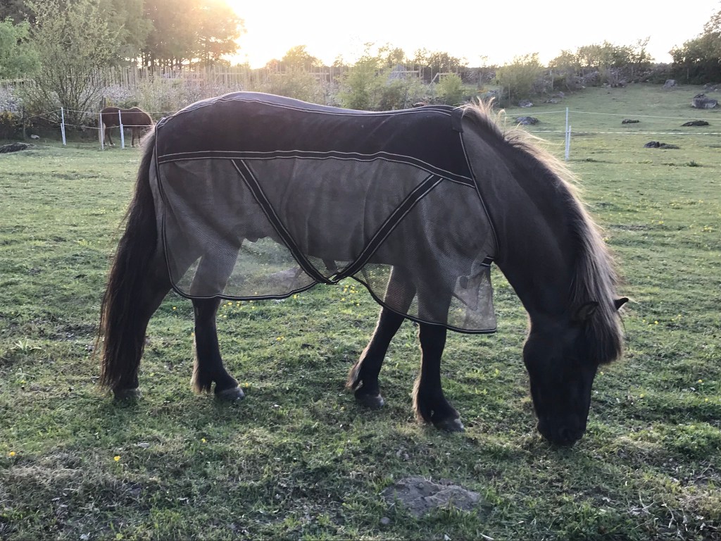 När vi kom tillbaka till hagen, testade jag att sätta på honom insektstäcket men det uppskattades inte av övriga som jagade honom. Konstigt att de inte verkar känna igen honom bara för att han får ett täcke på sig 🙂 Jag får fortsätta kämpa med det, så att han tillslut kan ha det dygnet runt. Som tur är så är temperaturen inte så gynnsam för insekter riktigt ännu – ibland är det riktigt bra med frostgrader 🙂