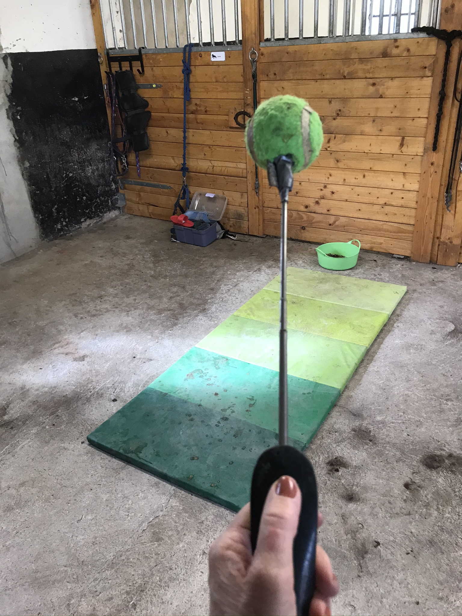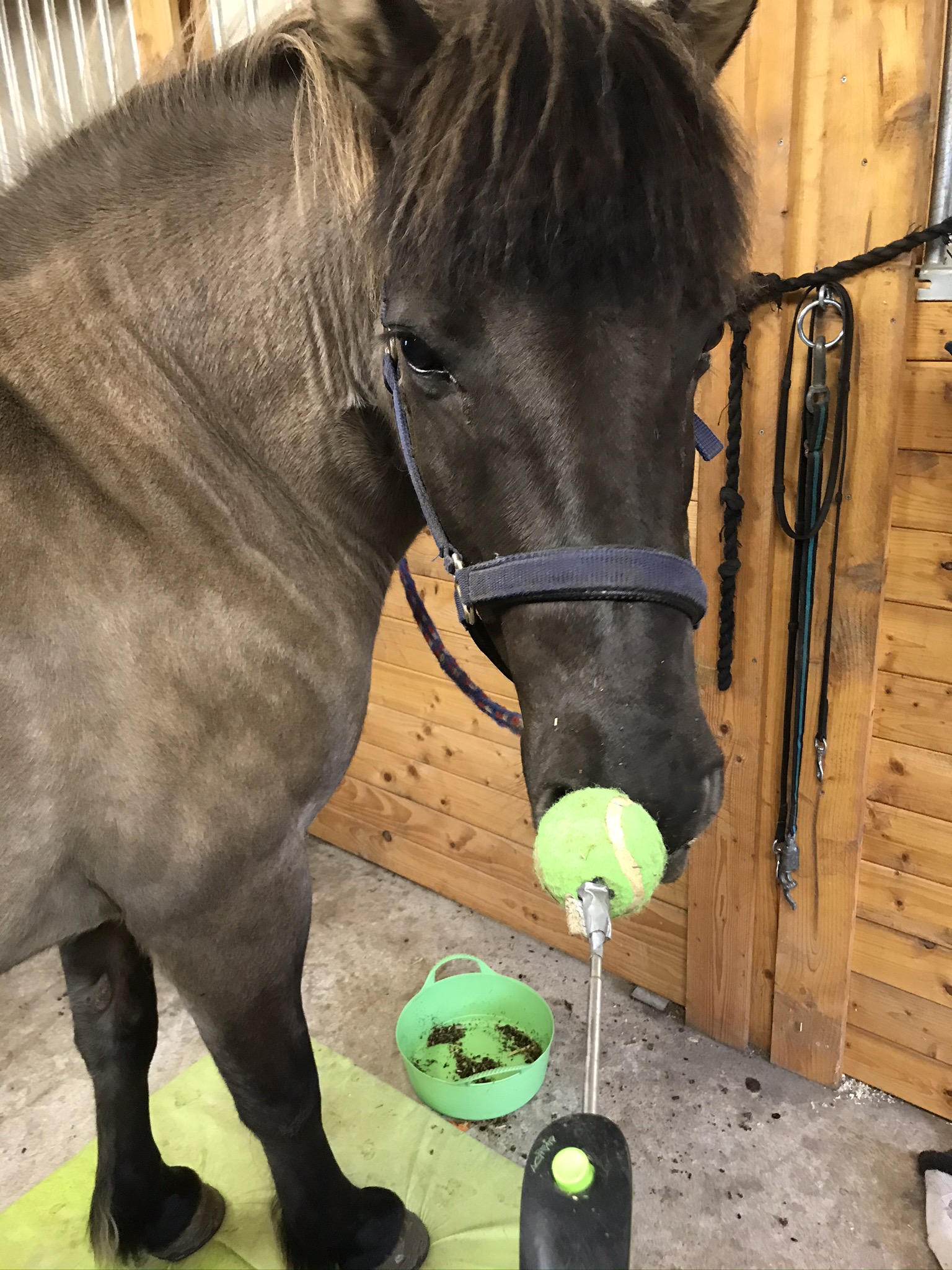 När jag kom till stallet, så var mina stallkompisar redan på väg ut på sin skogsrunda och Reykur var alltså ensam kvar i hagen. Det blir så ibland eftersom vår flock endast består av 4 hästar. Reykur sprang av och an i hagen och gnäggade efter sina kompisar. Jag tog in honom i stallet och vi tränade targetträning på IKEAs gympamatta. I början var Reykur lite okoncentrerad då han lyssnade efter kompisarna hela tiden, men ganska snart så började han fokusera på mig istället. Idag kunde han t.o.m. böja sig så långt åt sidan att han ”kysste stigbygeln” – så mjuk har han inte varit tidigare så det var toppenbra 🙂